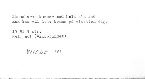 //// Skomakaren kommer med h$la sin rad Han kan väl icke komma på utsattan dag. //// IV 91 9 str. //// Mel. not (Wikbolandet). //// Wu- 3 t- ** ////