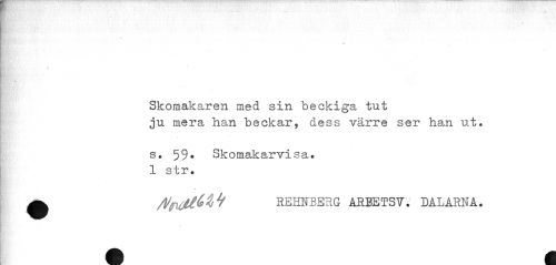 //// t //// Skomakaren med sin beckiga tut //// ju mera han beckar, dess värre ser han ut. //// s. 59. Skomakarvisa. 1 str. //// > //// m^ /vtrum^1* rehnberg areetsv. dalarna. //// • m ////