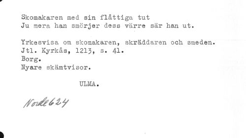 //// Skomakaren med sin flåttiga tut //// Ju mera han smörjer dess värre sär han ut. //// Yrkesvisa om skomakaren, skräddaren och smeden. //// Jtl. Kyrkås, 1213, s. 41. //// Borg. //// Nyare skämtvisor. //// ULMA. //// /Tw&é ty //// i ////