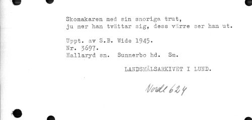 //// Skomakaren med sin snoriga trut, //// ju mer han tvättar sig, dess värre ser han ut. //// Uppt. av S.B. Wide 1945• //// Nr. 3697. //// Kallaryd sn. Sunnerbo hd. Sm. //// * //// LANDSMÅLSARKIVET I LUND. ////