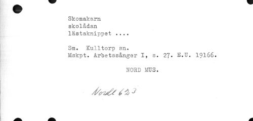//// Skomakarn skolådan //// lästaknippet ... Sm. Kulltorp sn. //// Mskpt. Arbetssånger I, s. 27* E.U. 19166» //// NORD MUS. ////