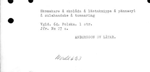 //// Skomakare å skolåda å lästaknippa å pännasyl å sulahandske å tummaring //// ^^ Vgld. 64* Polska. 1 str. //// Jfr. Nc 27 a. //// ANDERSSON SY LÅTAR. //// $ 3 ////