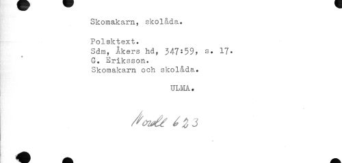 //// Skomakarn, skolåda. Polsktext. //// Sdm, Åkers hd, 347*59, s. 17- //// G. Eriksson. Skomakarn och skolåda. //// ULMA • //// Åcrvfr £23 ////
