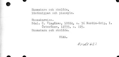//// Skomakare och skolåda, lästknippan och pinnsyln. //// Skomakarvisa. //// Sdml. Ö. Vingåker, 10924, s. 36 Hordin-Grip, I. //// Österåker, 12739, s. 225. Skomakarn och skolåda. //// ULMA. ////