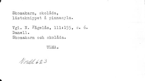 //// I //// Skomakarn, skolåda, lästaknippet å pinnasyln. //// Vgl. N. ^ågelås, 111:155, s. 6. Danell. //// Skomakarn och skolåda. //// i* //// ULMA. //// < //// k ////