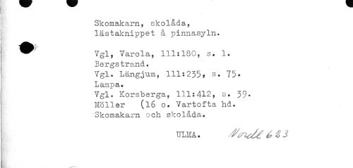//// ¦ //// Skomakarn, skolåda, lästaknippet å pinnasyln. //// ^^ Vgl, Varola, 111:180, s. 1. //// Bergstrand. //// Vgl. Längjum, 111:235» s. 75» //// Lampa. //// Vgl. Korsberga, 111:412, s. 39. Möller (16 o. Vartofta hd. Skomakarn och skolåda. //// ULMA. //// ¦BnPjiy ////