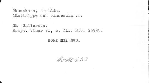 //// Skomakarn, skolåda, : //// lästknippe och pinnesuln... //// i //// Nä Gällersta. f //// Mskpt. Visor VI, s. 411. E.U. 23945- I //// = //// NORD 2SX MUS. ' //// ¦ //// I //// k f ////
