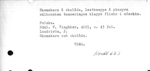 //// Skomakarn å skolåda, lestkneppa å pinsyrn sälhansken tummeringen klappa flicko i månskin. //// Polska. //// Sdml. V. Vingåker, 4165, s. 43 fol. //// Lundström, J. Skomakarn och skolåda. //// ULMA, ////
