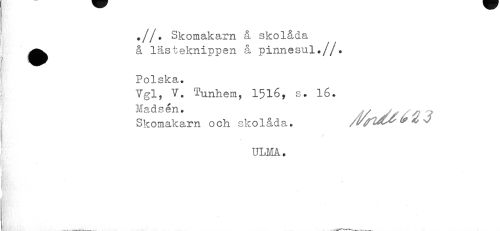 //// .//. Skomakarn å skolåda ^^ å lästeknippen å pinnesul.//• //// Polska. //// Vgl, V. Tunhem, 1516, s. 16. Mad sen. //// Skomakarn och skolåda. /i/^ld^ <* k> ^ //// ULMA. ////