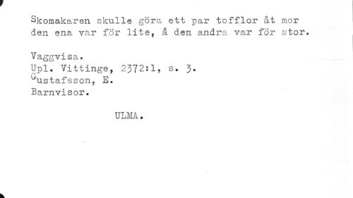 //// Skomakaren skulle göra ett par tofflor åt mor den ena var för lite, å den andra var för stor. //// | //// Vaggvisa,. //// Upl. Vittinge, 2372:1, s. 3. //// ^ustafsson, E. //// Barnvisor. //// ULM. //// k ////