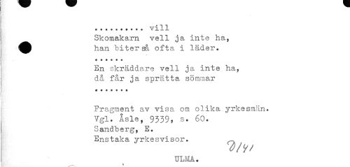 //// ... . vill //// Skomakarn vell ja inte ha, han biter sä ofta i läder. //// En skräddare vell ja inte ha, då får ja sprätta sömmar //// Fragment av visa om olika yrke s man * Vgl. Åsle, 9339, s. 60. Sandberg, E. Enstaka yrkesvisor. //// ULMA. ////