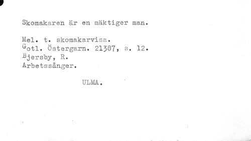 //// Skomakaren är en mäktiger man. //// Mel. t. skomakarvi s a • Gotl. östergarn. 21J87, s. 12. ^jersby, R. Arbetssånger. //// ULMA. //// 4 ////