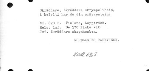 //// Skräddare, skräddare skrympelibein, //// i helviti har du din prässestein. //// * //// Nr. 628 B. Finland, Lappträsk. Hels. lmf. Se 578 Nicke Vik. Jraf. Skräddare skrynkornben. //// NORDLANDER BARNVISOR. ////