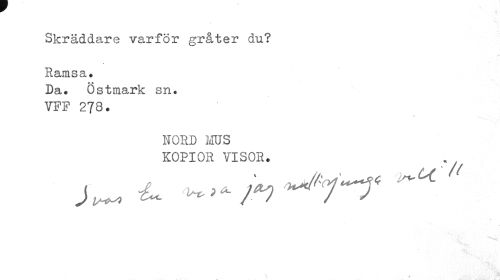 //// Skräddare varför gråter du? Ramsa. //// Da. Östmark sn. vff 278. //// NORD MUS //// KOPIOR VISOR. ^ fr //// \ » k>3l ////