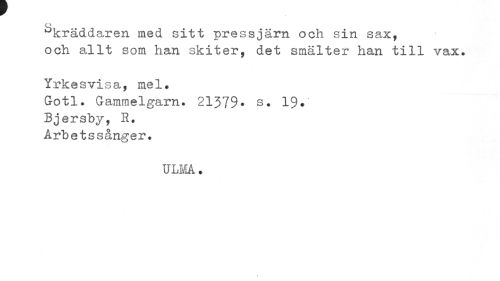 //// Q //// °kräddaren med sitt pressjärn och sin sax, //// och allt som han skiter, det smälter han till vax. //// Yrkesvisa, mel. //// Gotl. Gammelgarn. 21379* s. 19* Bjersby, R. Arbetssånger. //// o //// ULMA. ////