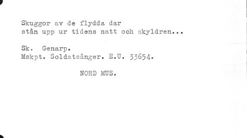 //// Skuggor av de flydda dar //// stån upp ur tidens natt och skyldren* ? ? //// i //// f //// Sk. Genarp. | //// Mskpt. Soldatsånger. E.U. 33654* //// NORD MUS. //// k ////