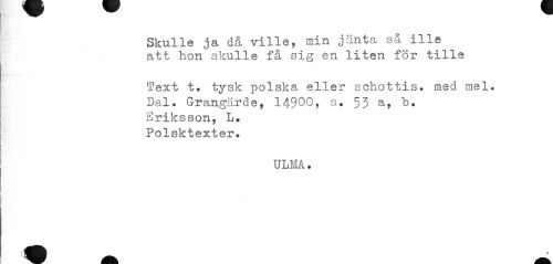 //// Skulle ja då ville, min jänta så i lie att hon skulle få sig en liten för tille //// Text t. tysk polska eller schottis. med mel. //// Dal. Grangärde, 14900? s* 53 st, b. //// Eriksson, L# //// Polsktexter. //// ULM. //// B ////
