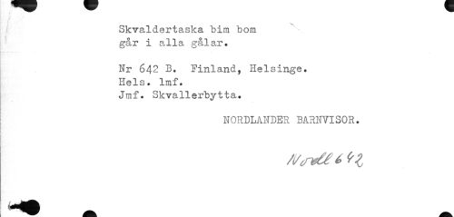 //// r. i f //// a! ¦ ' . :> //// V , . //// / Skvaldertaska bim bom //// går i alla gålar. //// Nr 642 B. Finland, Helsinge. //// Hels. Imf. //// Jmf. Skvallerbytta. //// NORDLANDER BARNVISOR. //// /!/crvé£é * l ////