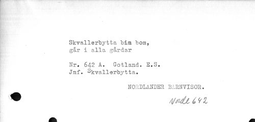//// •v //// Skvallerbytta bim bom, //// går i alla gårdar //// Hr. 642 A. Gotland. E.S. Jmf. ^kval1erby11 a. //// NORDLANDER BARNVISOR. ////