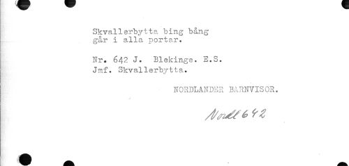 //// Skvallerbytta bing bång går i alla portar. //// Nr. 642 J. Blekinge. E.S. Jmf. Skval1erbvt t a. //// w //// NORDLANDER BARNVISOR. //// * ////