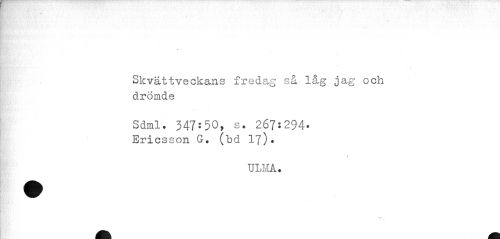 //// J //// Skvättveckans fredag så låg jag och drömde //// Sdml. 347:50, s. 267:294. Ericsson G. (bd 17). //// ULMA. ////
