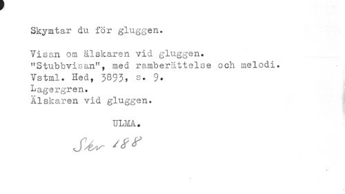 //// Skymtar du för gluggen. //// Visan om älskaren vid gluggen. "Stubbvisan", med ramberättelse och melodi. Vstml. Hed, J893, s. 9* Lagergren. //// Älskaren vid gluggen. //// UL MA. //// * ////