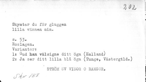 //// %0L //// ¦ //// Skymtar du för gluggen lilla vännen min. //// s. 53# //// Roslagen. //// Varianter: //// 1: &ud ]2an välsigne ditt öga (Halland) //// 2: Ja ser ditt lilla blå öga (Tunge, Västergtld.) //// % //// / //// STRÖM SY VISOR 0 RAMSOR. //// B ////