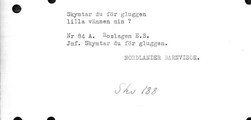 //// Skymtar du för gluggen lilla vännen min ? //// Nr 84 A. Roslagen E.S. //// Jmf. Skymtar du för gluggen. //// NORDLANDER BARNVISOR. //// J Xvr /B S ////