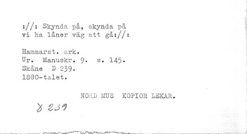 //// i //// i //// i //// ://: Skynda på, skynda på vi ha låner väg att gå://: //// Hammai-st. ark. Ur. Manuskr. 9. s. 145. Skåne D 239. 1880-talet. //// NORD MS KOPIOR LEKÅR. //// 2 | //// I i //// ___ .___ jT-^^^jT^^^ ... _ ___:___ ___ _ _ ) ////
