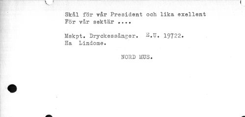 //// Skål för vår President och lika exellent För vår sektär ... //// Mskpt. Dryckessånger. ^.U. 19722. Ha Lindome. //// NORD MUS. //// .i ////