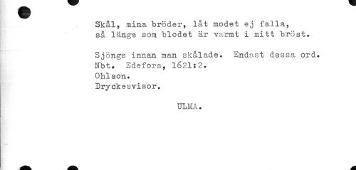 //// Skål, mina bröder, låt modet ej falla, så länge som blodet är varmt i mitt bröst. //// Sjöngs innan man skålade. Endast d 0 3 Sel ord. //// Nbt? Edefors, 1621:2. //// Ohlson. //// Dryckesvisor. //// ULM. ////