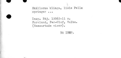 //// I \ //// Skällorna klinga, lisle Pelle springer ... //// ^ Insp. Htj. 12062-11 o. //// Porslund, Per-Olof, Valbo. (Ramsartade visor). //// RA INSP. ////