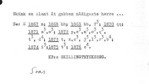 //// Skänk en slant åt gubben nådigaste herre ... //// Se: E 1867 nj 1868 hh; 1869 bb, f5; 1870 qq? //// 1871 a3,o3; 1872 p,o5,q3, t\ d4; 18H t, x,e3, j5,l?,r5,b4; //// 1874 i5;1875 t5; 1876 c4. //// KB:s SKILLINGTRYCKSREG. //// $ trtS) ////