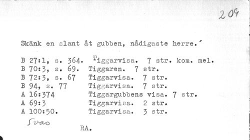 //// 1 09 //// i //// Skänk en slant åt gubben, nådigaste herre,' //// m //// B 27:1, b. 364* Hggarvisa. 7 str. kom. mel. j //// B 70: 3> s. 69. Tiggaren. 7 str. B 72:3, s. 67 Tiggarvisa. 7 str. B 94> s. 77 Tiggarvisa. 7 str. A 16:374 Tiggargubbens visa. 7 str. //// A 69:3 Tiggarvisa. 2 str. //// A 100:50. Tiggarvisa. 3 str. //// /Vt*O //// RA. //// I ////