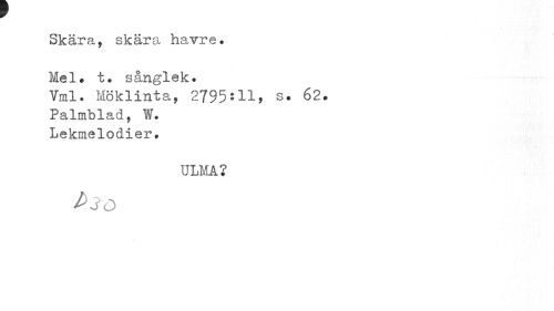 //// Skära, skära havre. Mel» t. sånglek. //// Vml. Möklinta, 2795-11, s. 62. //// Palmblad, W. Lekmelodier» //// ULM? //// l>3ö ////