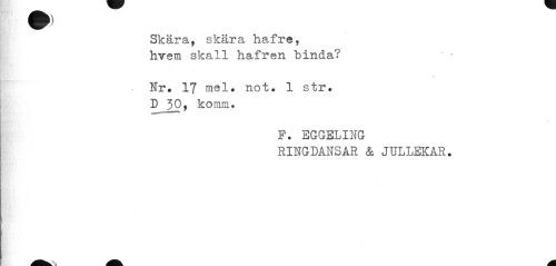 //// Skära, skära hafre, hvem skall hafren binda? //// « //// Nr. 17 mel. not. 1 str. D 30, komm. //// i //// F. EGGELIHG //// RINGDANSAR & JULLEKAR. ////