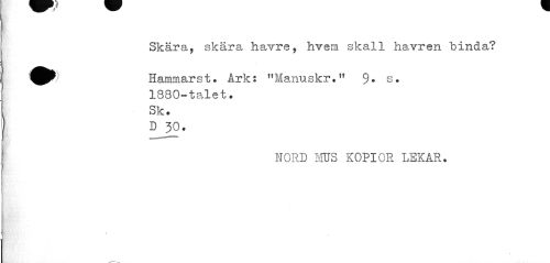 //// Skära, skära havre, hvem skall havren binda? //// ^^ Hammarst. Ark: "Manuskr." 9* s. //// 1880-talet. //// Sk. //// HORD MUS KOPIOR LEKAR. //// t ////