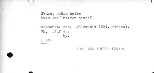 //// ... //// I .• //// 87 ¦ ... . //// Kgfl^. 'v''": //// Skära, skära hafre Hvem ske/ hafren binda? //// ¦ //// .» //// Hammarst. ark. folkmusik (Mel» finnes). //// - //// Sk. Bjuf sn. //// " by. //// D 30. //// NORD OTS KOPIOR LEKAR. ////