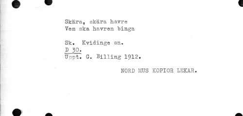 //// % //// Skära, skära havre Vem ska havren binga //// Sk. Kvidinge sn. D_ 30. //// Uppt. G. Billing 1912. //// NORD MUS KOPIOR LEKAR. //// ¦ B) ////