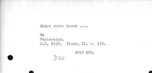 //// £ //// Skära skära havre ... //// Sk //// Västerstad. //// S.U, 8156. Visor, II. s. 139» //// NORD MUS. ////