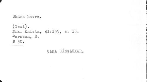//// r //// Skära havre* //// (Text). I //// Nrk. Knista, 41*135, s. 15. | //// ^arsson, R. //// D 30. [ //// ULMA SÅNGLEKAR. \ //// | //// B //// k ////