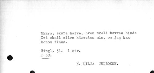 //// Skära, skära hafre, hvem skall havren binda Det skall allra kärestan min, om jag kan honom finna. //// Ringl. 31* 1 str. ^ D 30. //// N. LILJA JULBOKEN? ////