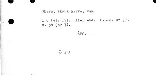 //// # //// Skära, skära, havre, vem //// £ 1:6 (el. 12). KY-LO-SJ. S.L.S. nr 77. //// s. 33 (nr 7). //// ÅBO. //// 7)34 //// ¦ ////