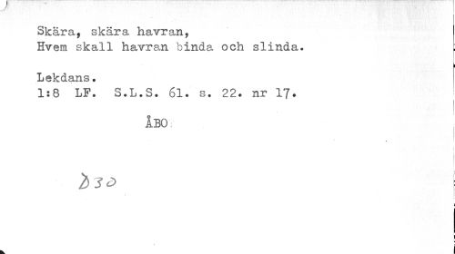 //// Skära, skära havran, //// Hvem skall havran binda och slinda. ; //// i //// Lekdans. //// 1:8 LF. S.L.S. 61. s. 22. nr 17. //// ABO ; //// I l //// Ib so //// < //// i //// I ¦ //// i ////