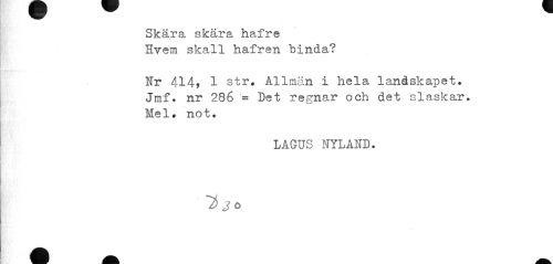 //// Skära skära hafre Hvem skall hafren "binda? //// Nr 414, 1 str. Allmän i hela landskapet. Jmf. nr 286 = Det regnar och det slaskar. Mel. not. //// LAGUS NYLAND. //// H) JO ////