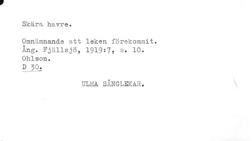 //// Skära havre. //// Omnämnande att leken förekommit. //// Ing. Fjällsjö, 1919=7, s. 10. Ohlson. D 50. //// ULMA. SÅNGLEKAR. \ ////
