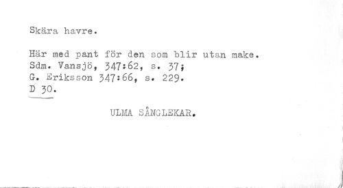 //// Skära havre» //// Här med pant för den som blir utan make. Sdm. Vansjö, 347*62, s. 37$ G-. Eriksson 347:66, s* 229. D 30. //// ~ b i I—p. //// ULMA SÅNGLEKAR. //// I //// j ////