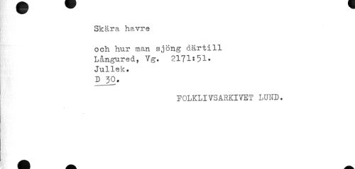 //// Skära havre //// och hur man sjöng därtill Långured, Vg. 2171:51. Jullek. D 30. //// FOLKLIVSARKIVET LUND. //// % ////