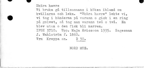 //// Skära havre //// Vi bruka gå tillsammans i köken ibland om kvällarna och leka» "Skära havre" lekte vi, ^^ vi tog i händerna på varann o gick i en ring //// på golvet, så tog man varann två o två. En blev utan o den fick bli narren. //// IFGH 3710* Upp* Maja Ericsson 1935» Sagesman J. Wahlström f. 1860. Vrm Kroppa sn. D 30» //// NORD MUS. ////