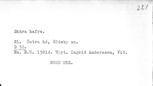 //// 21/ //// i //// Skära hafre. //// k : //// Bl. Östra hd, Rödeby sn. D 50. //// ifm. E.U. 13814» Uppt. Ingrid Andersson, Viö. //// % i //// 1 //// NORD MUS. //// L //// I //// I ////